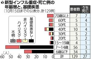 インフルエンザでは、ぜんそく、腎不全、糖尿病、心臓病、妊婦などが「ハイリスク」で重症化しやすいとされるが、該当するのは46人(死亡16人)で、基礎疾患のない人が74人(死亡7人)にのぼった。